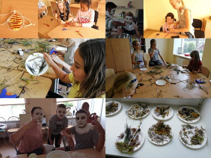 Pēc pusdienām lietišķās mākslas darbnīcās top sejas maskas no ģipša, glezniņas no dabas materiāliem un rotas no dzijas.