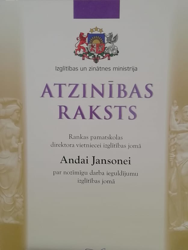 2020.gada 1.septembrī saņēma Izglītības un zinātnes ministrijas ATZINĪBAS RAKSTU par nozīmīgu darba ieguldījumu izglītības jomā.