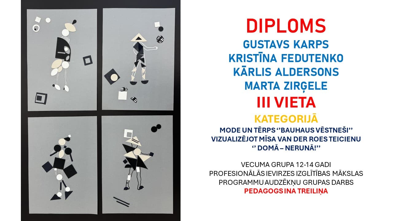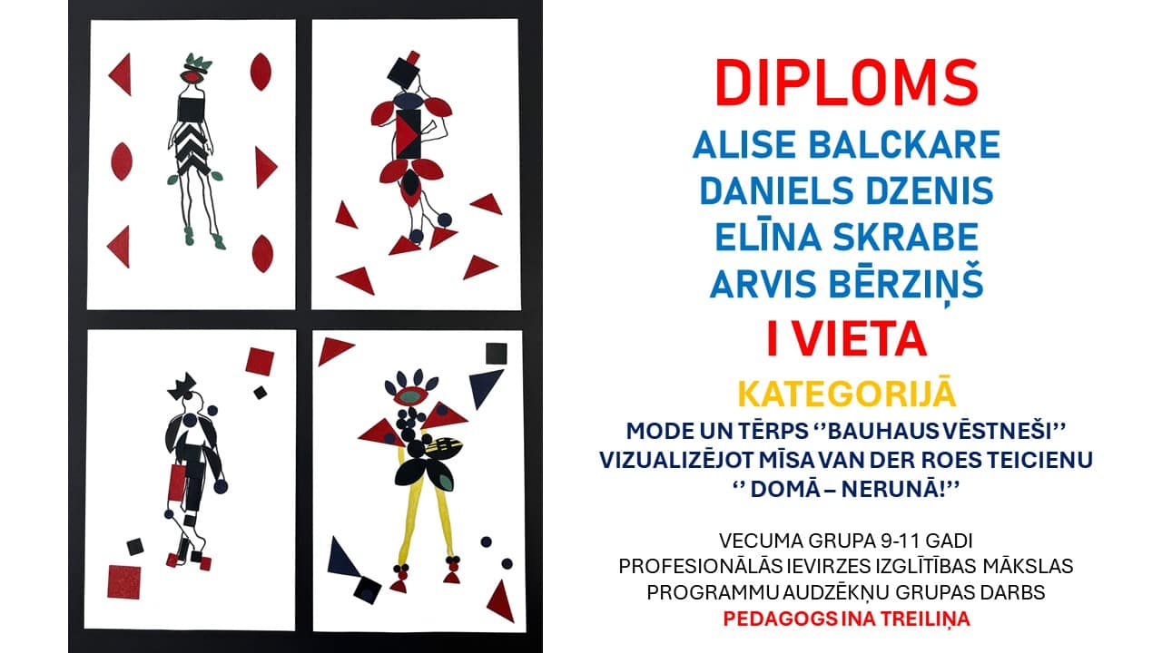 49.starptautiskajā bērnu mākslas izstādē ‐ konkursā “Lidice 2021” šogad piedalījās 1.klases skolēnu komanda – Elīna Skrabe, Samanta Smutova, Gustavs Karps, Roberts Vasiļjevs, Kārlis Aldersons. Viņi izveidoja kopīgu darbu par tēmu “ROBOTS un mākslīgais intelekts”. Darbs ir augstu novērtēts un iekļuvis laureātu skaitā. 1.kārtas laureātu darbi tiek izvirzīti izstādei-konkursam Čehijā. Lepojamies.