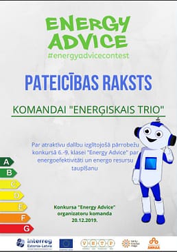 Trīs meitenes (Justīne Aldersone, Agrita Kerija Medejse un Krista Kristiāna Brence – komanda “Enerģiskais trio”) vairāku nedēļu garumā piedalījās Kurzemes Demo centra organizētajā konkursā “Energy Advice”, kas noslēdzās 20.decembrī. Skolotājs-konsultants – S.Petrovska.