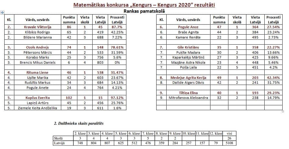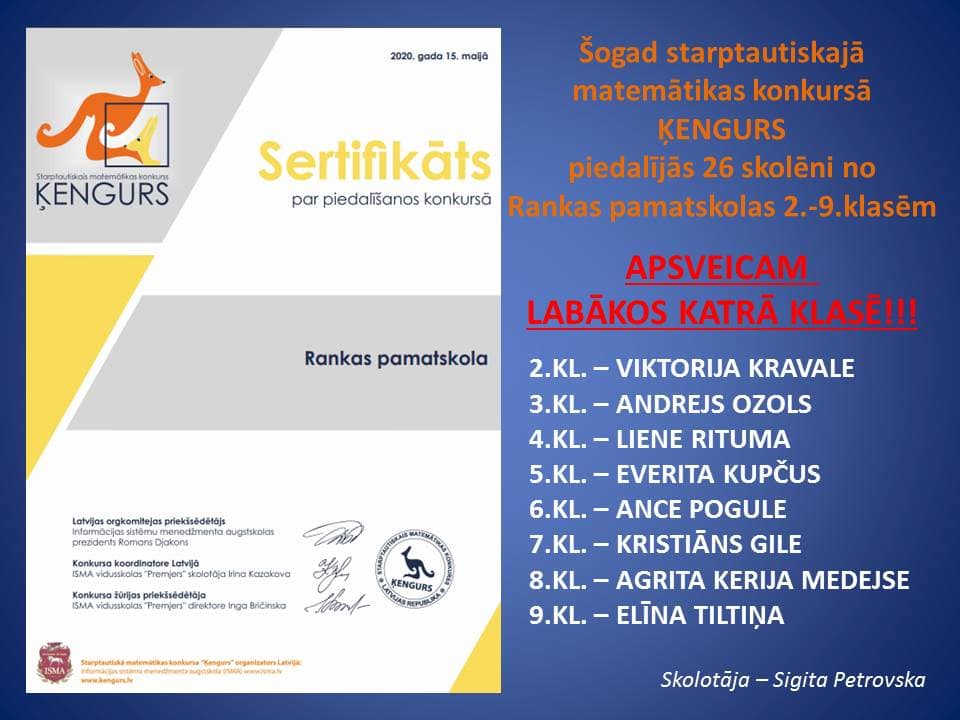 Starptautiskais matemātikas konkurss “ĶENGURS”: piedalījās pavisam 31 skolēns no 2. līdz 9.klasei un uzrādīja labus rezultātus – skolotāja Sigita Petrovska