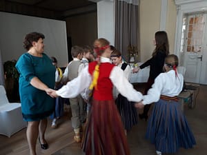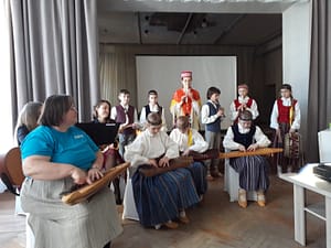 Projekta vadītāja A.Medejse prezentēja projekta realizācijas gaitu, bet folkloras kopas dalībnieki ar spēlēšanu, dejošanu iepriecināja pasākuma dalībniekus, demonstrējot gan darinātos vainadziņus, gan jaunos tērpus, gan savu prasmi uzstāties.